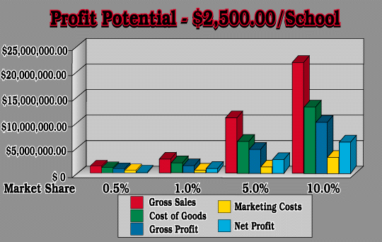Using the preceding sales and expense analyses, income projections werecalculated for .5, 1, 5, and 10% of the market share for sales of both $1,500,$2,000, and $2,500 per school. The data indicates a break-even point ofapproximately 1% in sales for the $1,500 per school average, 0.6% in salesfor the $2,000 per school average and less than 0.5% in sales for the $2,500per school average. Tables 5, 6, and 7, along with their accompanying chartspresent these projections in detail.
